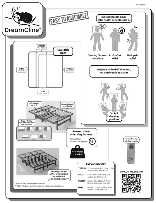 Discover the first and only adjustable bed engineered specifically for incline sleeping — the DreamCline™ Incline Frame. Designed to promote healthier sleep posture, improved breathing, and better circulation, DreamCline™ redefines what an adjustable bed can do.